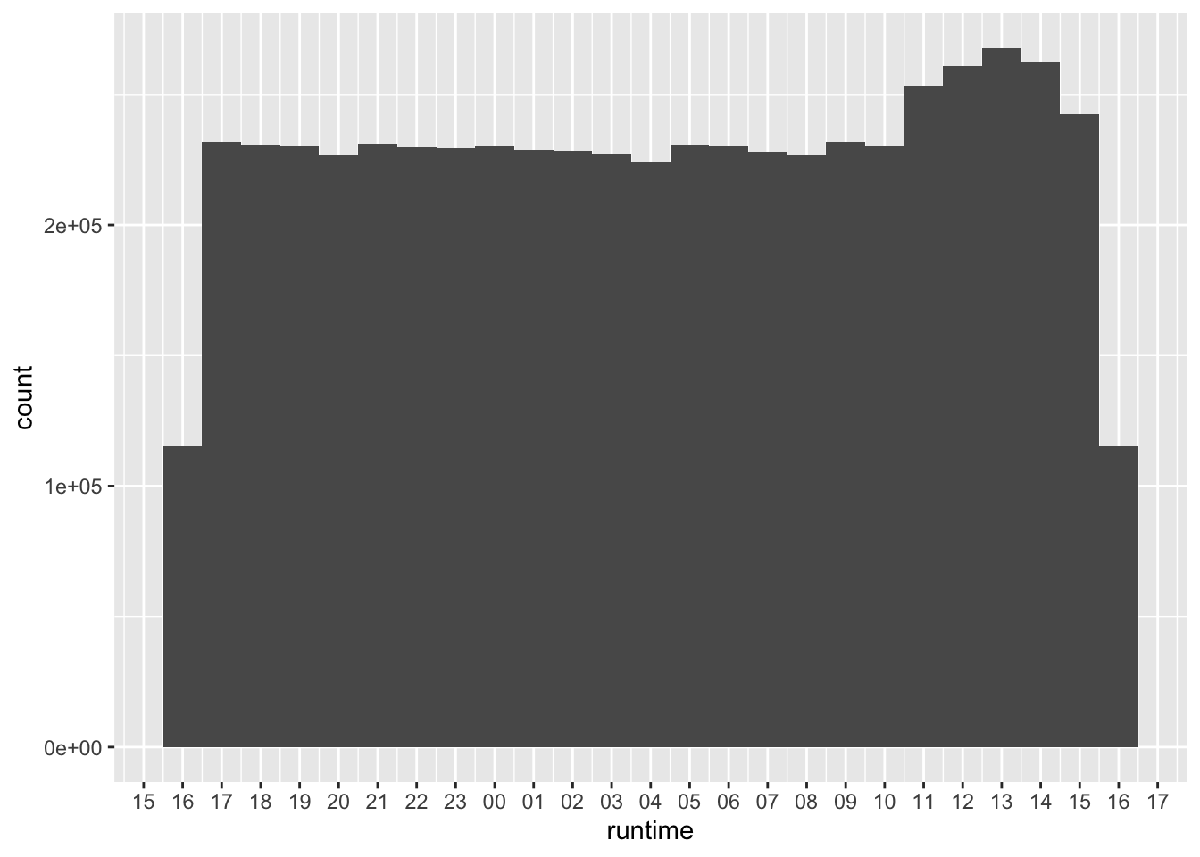 In making Figure 1, I convert the date component of runtime to the same date (2017-01-01). This facilitates plotting in R, as R has no native “time” type and thus things are easier using date-times. Unfortunately, it seems that all the timestamps in bikes are boring back-end times produced by systems, so there is nothing special about the distribution of these times. More interest plots might come from looking at when bikes are checked out and in (only net checkouts seem to be available) assuming that the data are sufficiently frequent.