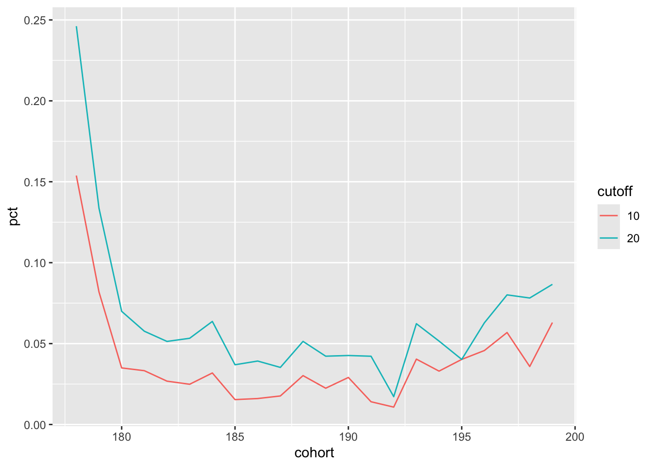 mutate(cohort = century(first_rep_term))Here first_rep_term is the exposure date and first_sen_term is the event date. Note that cohorts_revised includes both survival data (i.e., values for exposure date and event date) and cohort data and is focused exclusively on the population of interest. In other contexts it might make sense to calculate cohorts and survival data in separate queries before merging them.9