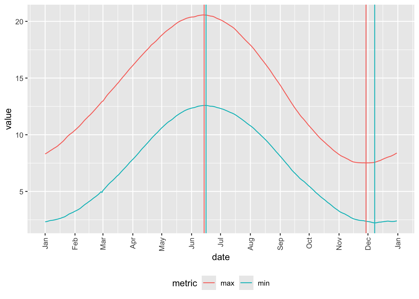 Daily temperature data from Open-Meteo comprise a maximum and minimum temperature. So immediately we have two possible definitions of each season according to the temperature we use (e.g., summer could be the 91-day period that has the highest average minimum temperature or it could be the period that has the highest average maximum temperature). Here we consider both.