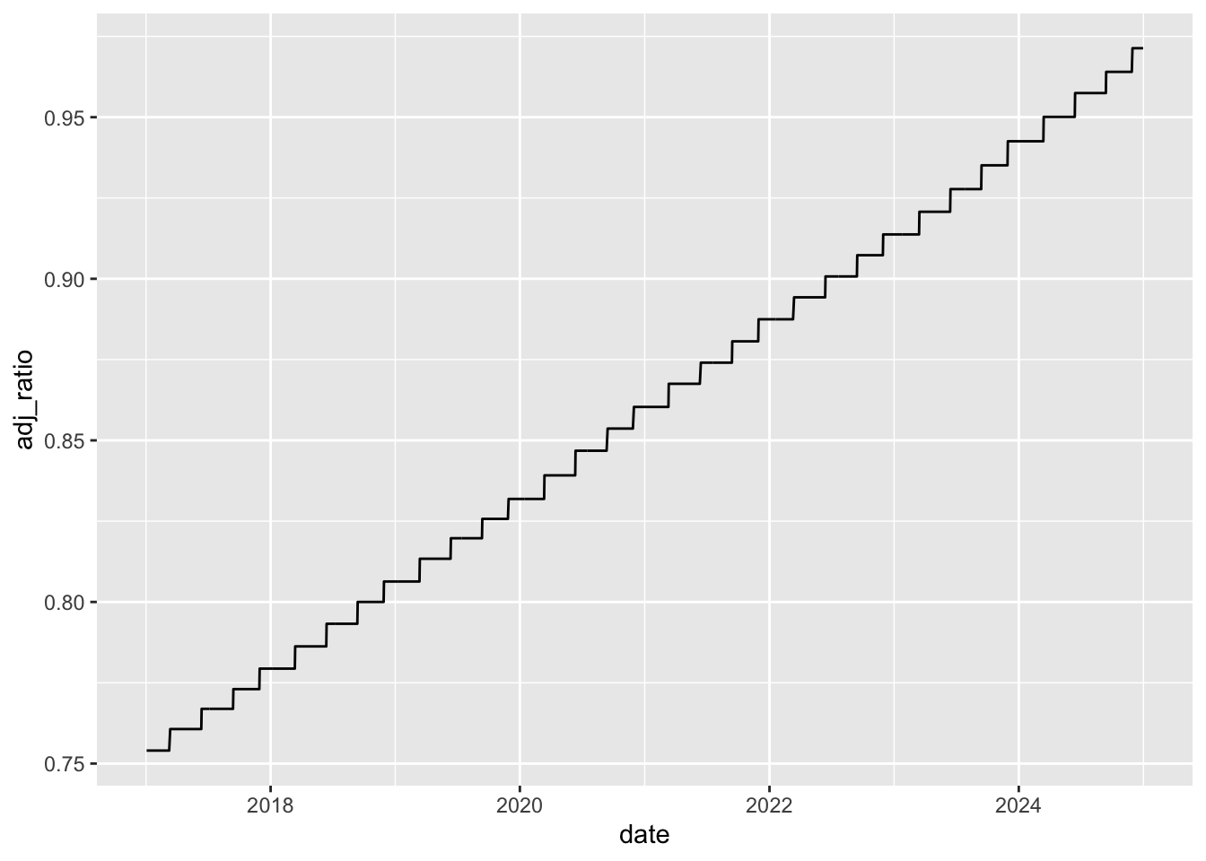We can see a couple of things in Figure 1. First, the adj_ratio (defined as adjusted divided by close) equals one at the end of the period of our data set. Second, it appears that adj_ratio is a step function with respect to time: it is constant for periods, then steps up in discrete amounts on certain dates. This latter fact is consistent with “corporate actions such as dividends” occurring relatively infrequently on discrete dates.