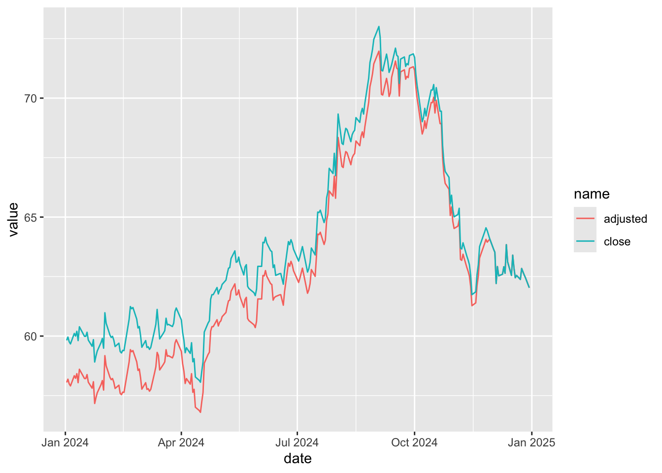 ko_prices <- tq_get("KO", from = "2017-01-01", to = "2024-12-31")If we look at the data, we see the following: