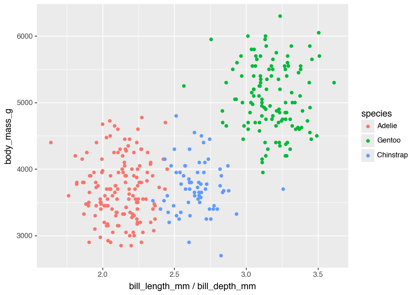 .aes(x="bill_length_mm / bill_depth_mm", y="body_mass_g")