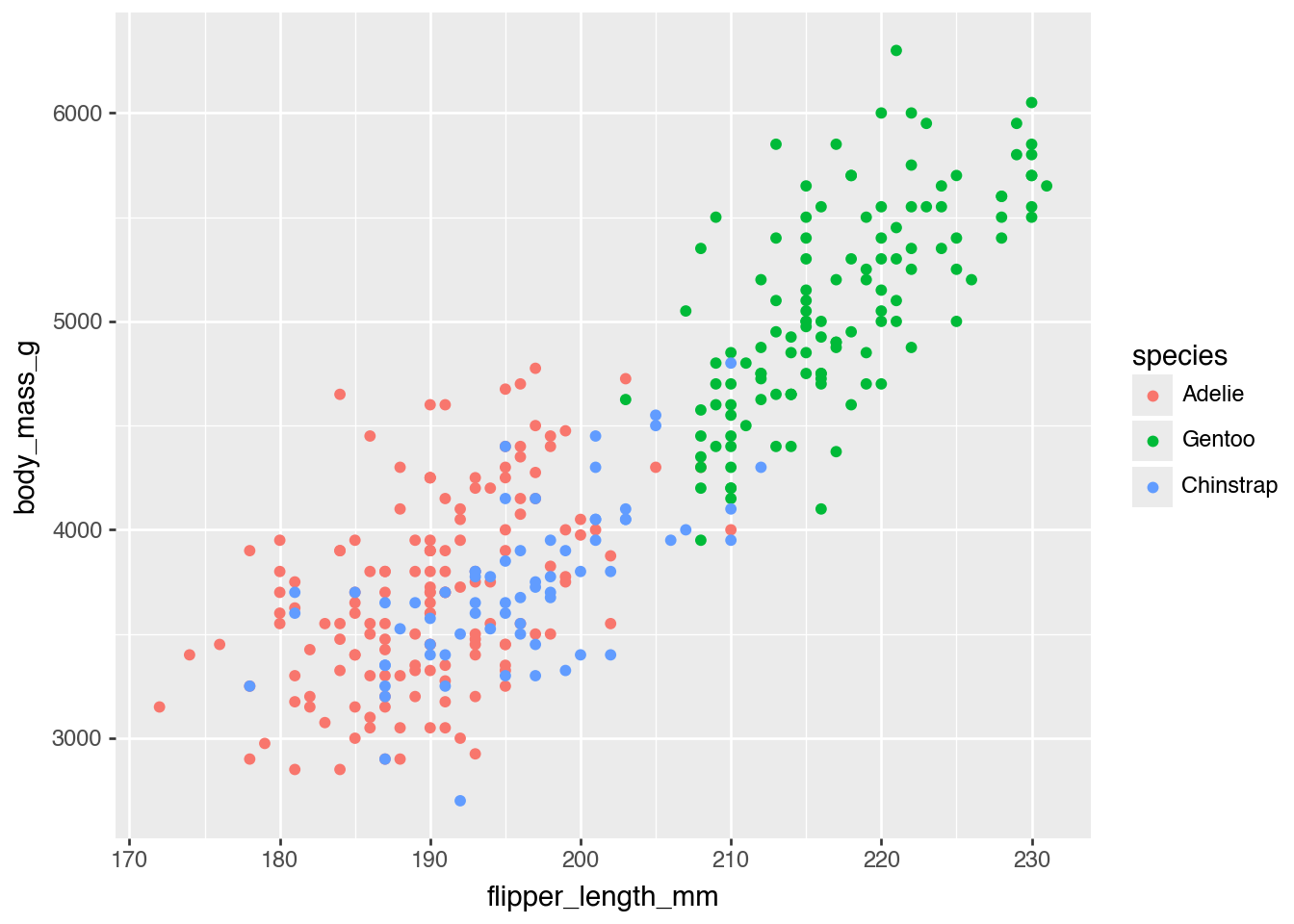 .aes(x="flipper_length_mm", y="body_mass_g", color="species")