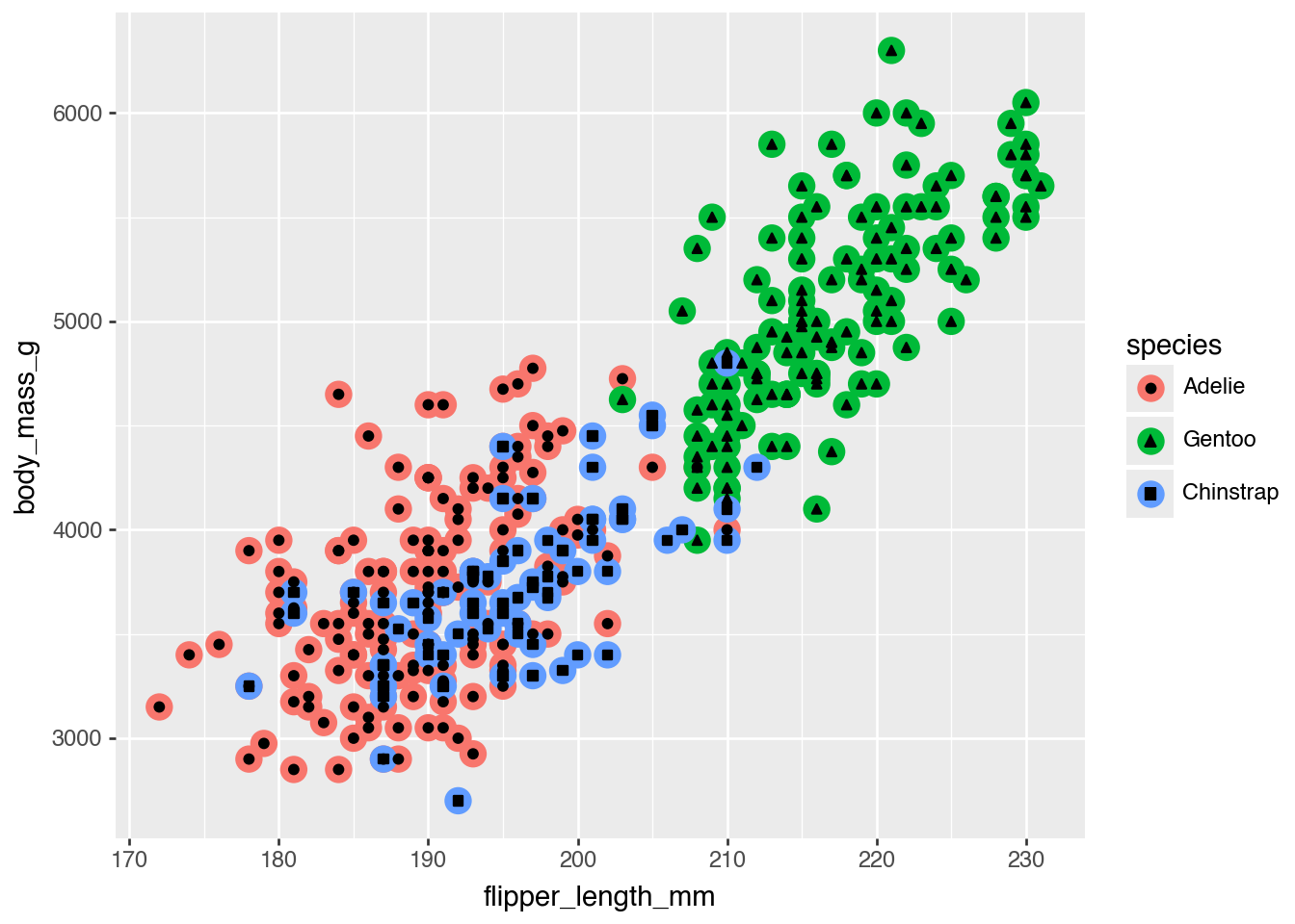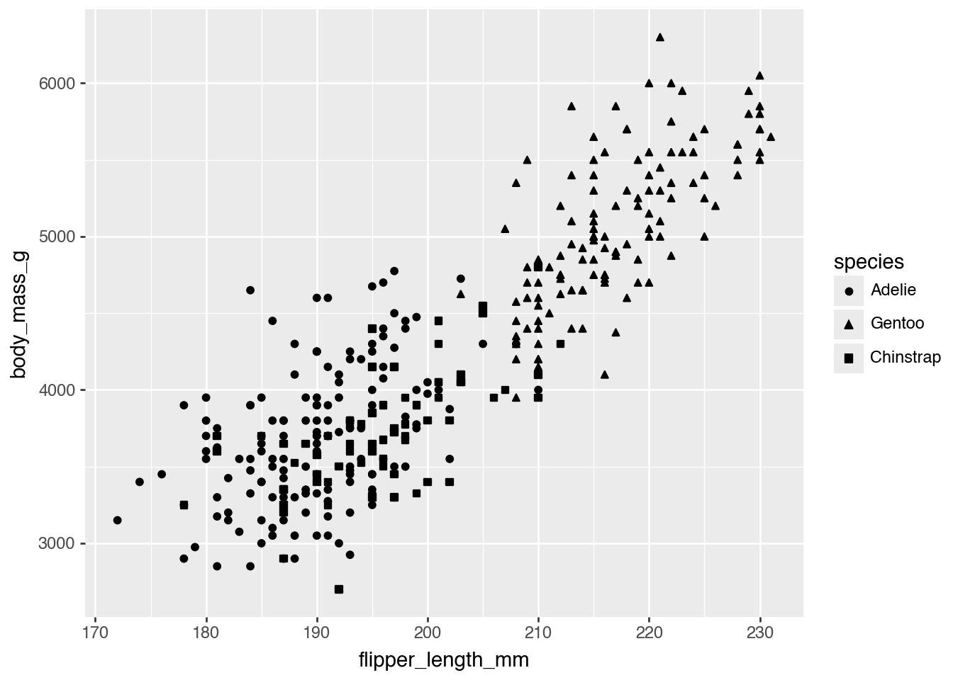 .aes(x="flipper_length_mm", y="body_mass_g", shape="species")